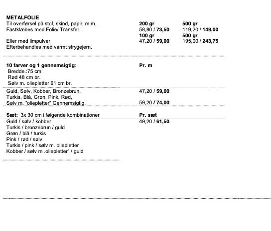Metalfolie: Du kan få guld, sølv, kobber, bronzebrun, turkis, pink (til overførsel på stof, skind, papir m.m. Fastklæbes med Transferlim/Rammelim) Bredde: 75 cm. Folierne fås både i sæt med 0.30 m eller i metermål.