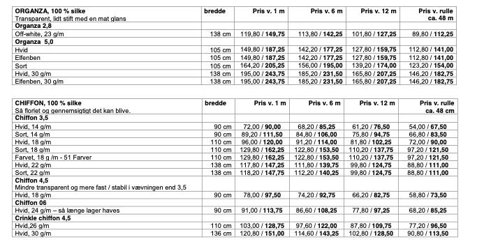 S p e k t r u m h a r e t b r e d t u d v a l g a f s t o f f e r i n a t u r m a t e r i a l e r , s ås o m s i l k e i d i v . v æv n i n g e r , s t r u k t u r e r , k v a l i t e t e r o g t y k k e l s e r . V i h a r b o m u l d s v a r e r i v æv e d e ( o g s t r i k k e d e k v a l i t e t e r ) , h v o r a f m a n g e e r øk o l o g i s k e , s a m t v æv e d e b l a n d i n g e r i s i l k e o g b o m u l d . V i f ør e r v æv e d e m e t e r v a r e r i h ør , r a m i e , h a m p o g u l d . D e f l e s t e k v a l i t e t e r e r h v i d e e l l e r u b l e g e d e , n o g l e f ås i s o r t , velegnede til dischargeteknikker o g p o n g e e 0 5 o g c h i f f o n 3 , 5 f ør e r v i i e t s t o r t u d v a l g a f f a r v e r . V i s æl g e r i s m å m æn g d e r , f r a 3 0 c m o g o p t i l h e l e r u l l e r . H v a d d u s e r h e r e r e t u d v a l g a f h v a d v i h a r i b u t i k k e n . H a r v i i k k e d e n k v a l i t e t d u s øg e r , p r øv e r v i g e r n e a t s k a f f e d e t t i l d i g .